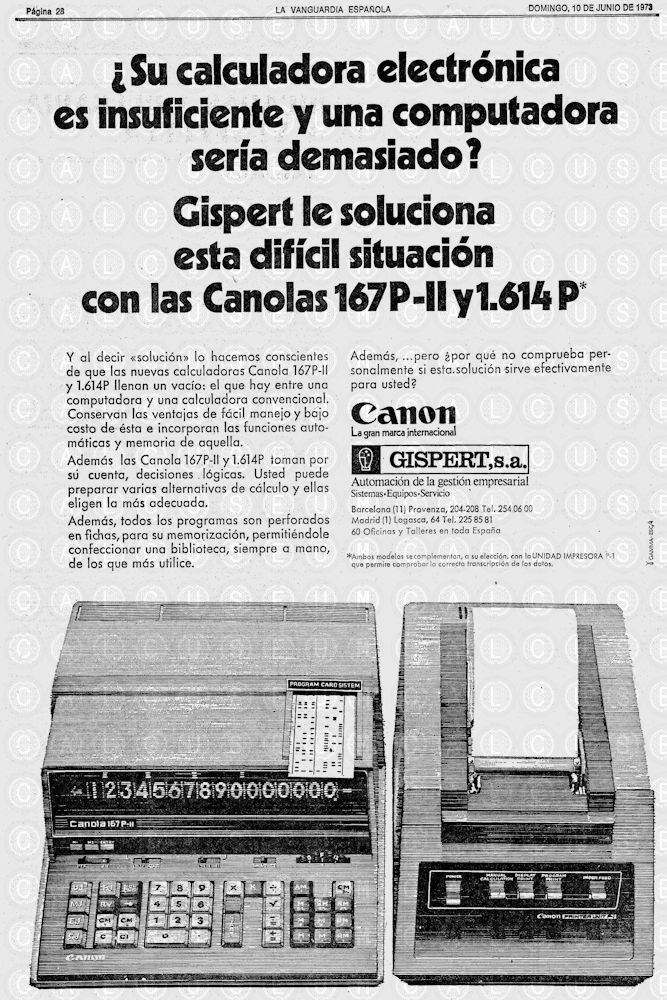 Las primeras calculadoras Canon basadas en circuitos integrados se desarrollaron en colaboración con Texas Instruments. Las dos primeras cifras del número de modelo generalmente representan la cantidad de dígitos en la pantalla. La que se expone en este museo es el modelo Canola 1614P, la última de la tercera generación de calculadoras electrónicas de Canon, que comenzó con la Canon 141 y a la que le siguieron los modelos 162, 162P, 163, 167 y 167P.