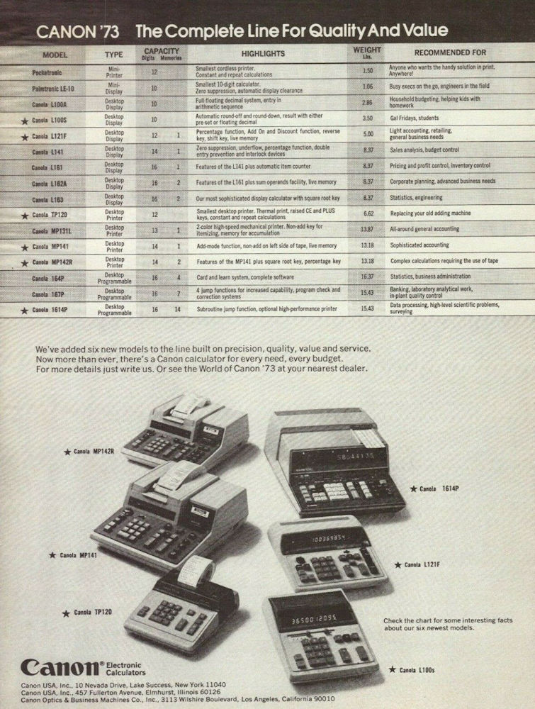 En julio de 1963, la empresa japonesa Canon Camera Company completó lo que posiblemente fuera el primer prototipo de calculadora electrónica de diez teclas y transistores, la “Canola 130” (ver imagen), como su primer paso en el mercado de equipos profesionales. La dirección de Canon dudaba de que una empresa de cámaras fotográficas pudiera tener éxito comercial con una calculadora electrónica, y no procedió a la fabricación hasta después de que Friden y Sharp introdujeran máquinas similares, en 1964. Eran consideradas sólidas, fiables y fáciles de usar, y fueron aceptadas rápidamente en oficinas y fábricas de la mayoría de los países del mundo.