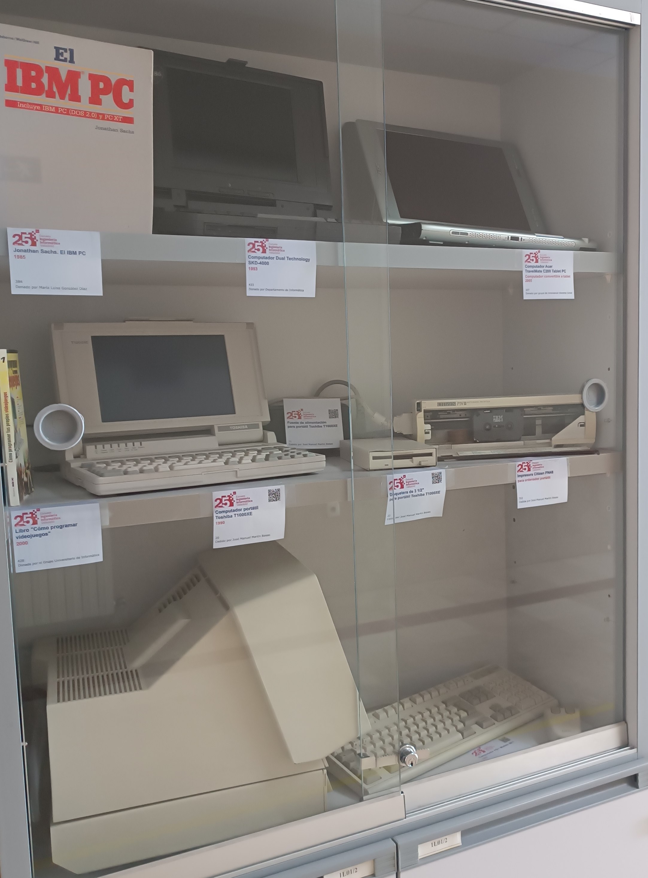 - PC-XT con monitor monocromo y MS-DOS. Este era el modelo de computador de cada uno de los puestos de trabajo práctico de los primeros estudios universitarios de Informática en Valladolid en 1985.