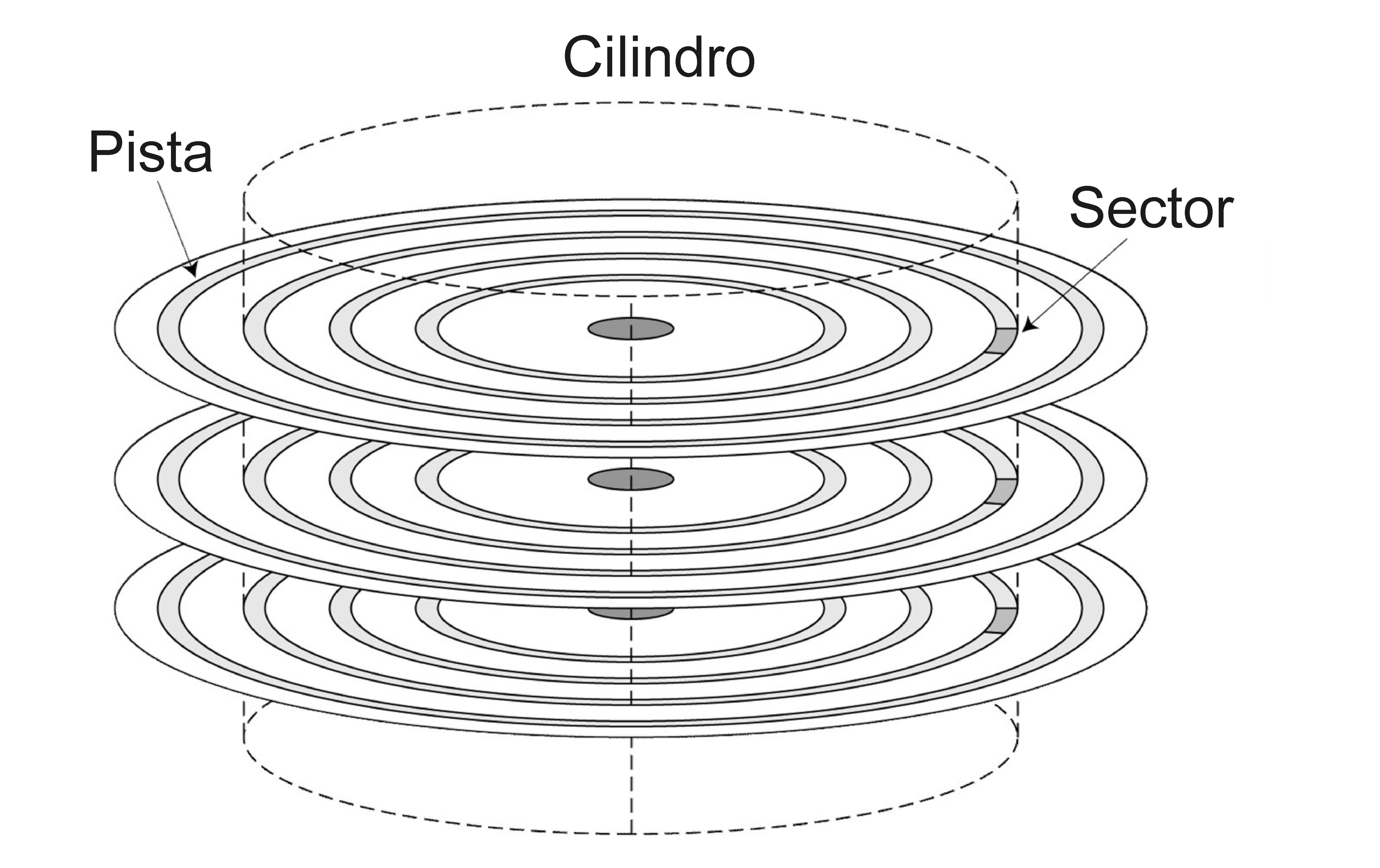 La información del disco en cada plato se organiza en pistas, que son círculos concéntricos con diferentes radios donde se acumulan las partículas magnéticas que almacenan los bits. Se llama cilindro al conjunto de pistas que tienen el mismo radio en todos los platos, es decir, a toda la información a la que se puede acceder sin mover el brazo.