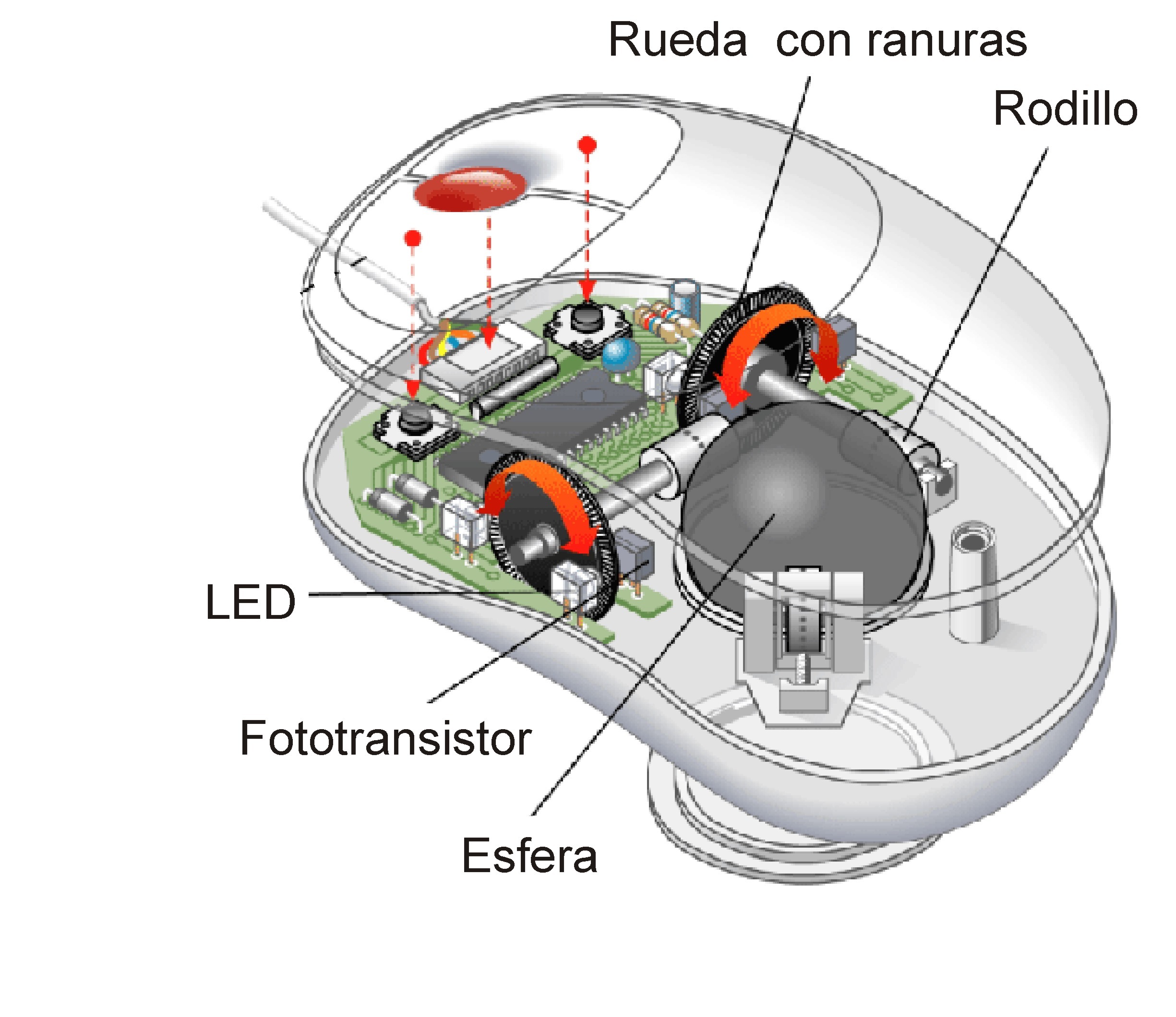 El funcionamiento de los primeros ratones se basaba en la misma idea que el prototipo, aunque mejorada. En lugar de ser las ruedas las que directamente tocaran la superficie de la mesa, era una esfera de goma que rozaba con unos rodillos perpendiculares solidarios a unas ruedas dentadas, o con rendijas, que estaban situadas entre un LED y un fototransistor, de forma que se puedan contar las rendijas que pasan. De esa forma, el número de rendijas contadas es proporcional a la variación de cada coordenada cartesiana. El inconveniente de los ratones mecánicos es que la esfera va recogiendo suciedad de la mesa por la que rueda, y eso, a la larga, provoca que los rodillos patinen sobre la esfera y no reflejen correctamente el movimiento del ratón.