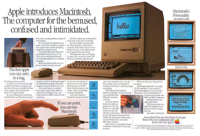 El Macintosh, tras el fallido intento del Apple Lisa, fue el primer ordenador con un sistema operativo exclusivamente gráfico y con ratón como estándar, pensado para que el usuario se dedicara a trabajar con las aplicaciones (numerosas, de calidad y con la gran ventaja del WYSIWYG, lo que hizo que arrasara el mercado de autoedición, creatividad publicitaria y diseño) en lugar de dominar primero el ordenador.